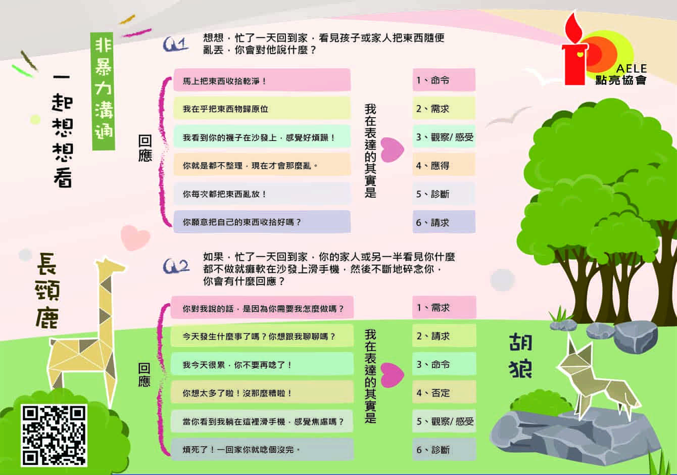 以上這些都是暴力語言,話語中充滿指責、貼標籤、抱怨,忽略了我們所看到的「事實」,也沒把我們的感受「清楚地」讓孩子知道,最重要的是沒有因為這些感受而提出我們的需要,請孩子「滿足」我們的需要。