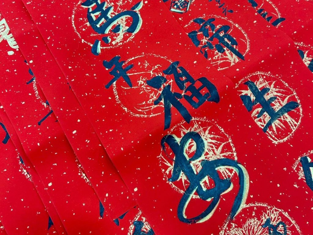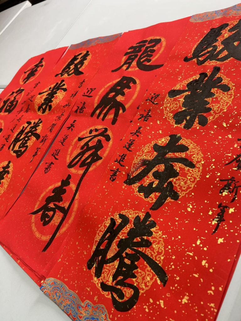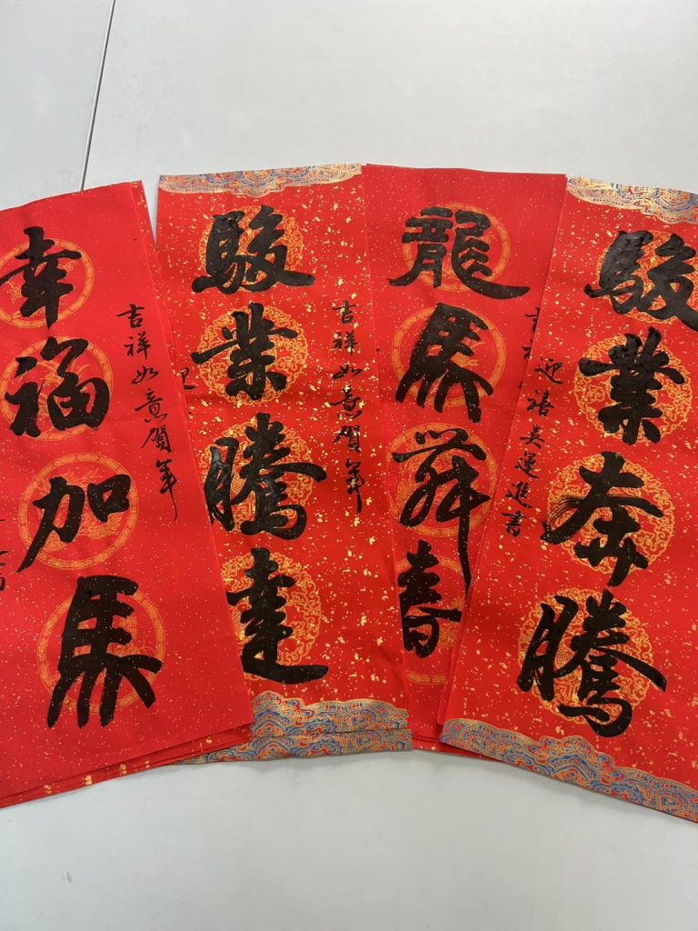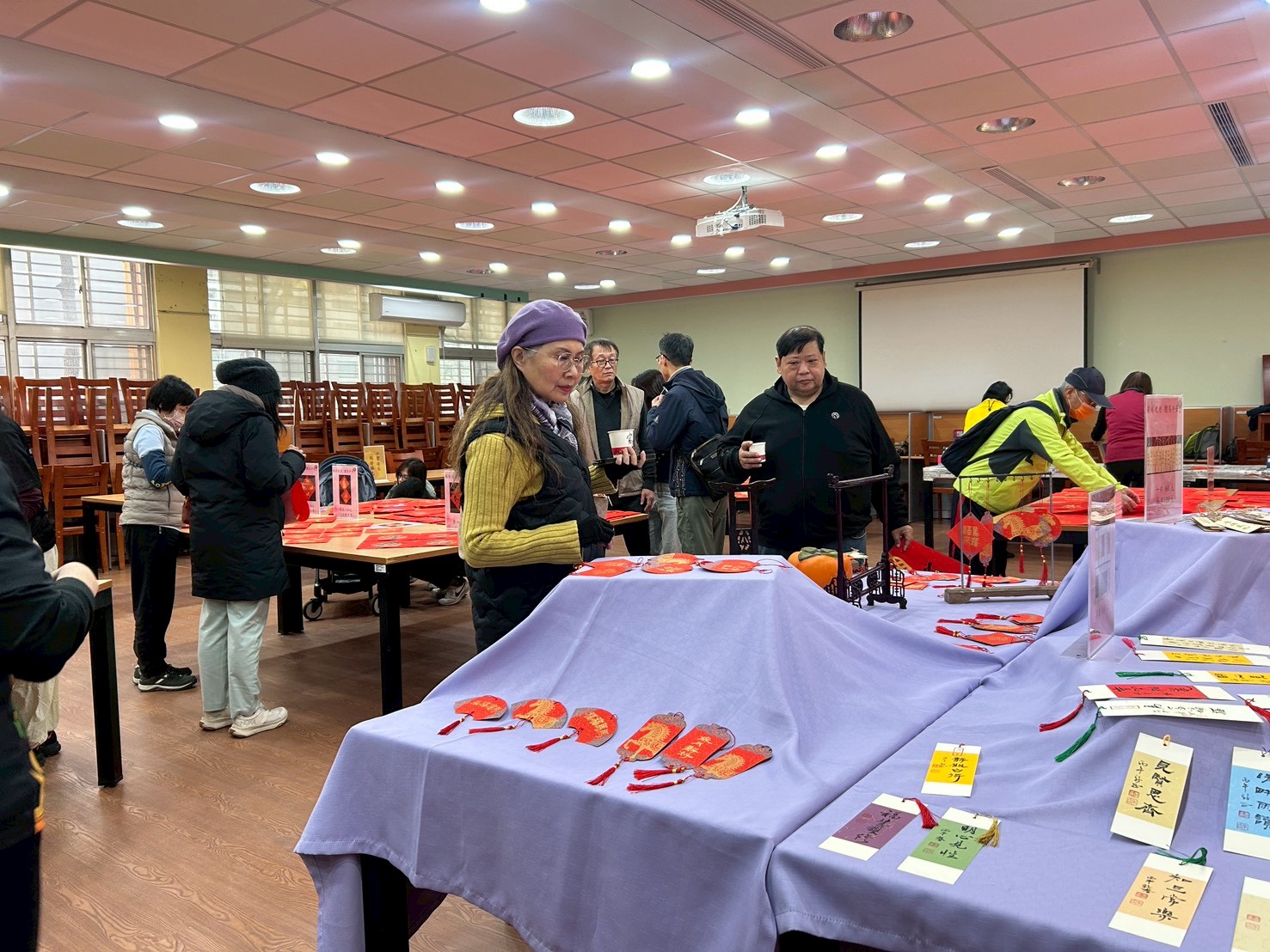 當天活動剛開始,人潮便絡繹不絕,春聯與掛飾很快便銷售一空。老師親筆揮毫的桌前排起長龍,紅紙鋪開、墨香瀰漫,大家耐心等候,一邊與老師閒話家常,滿心期待著那份對來年的祝福。